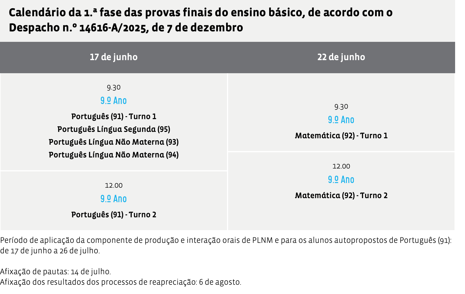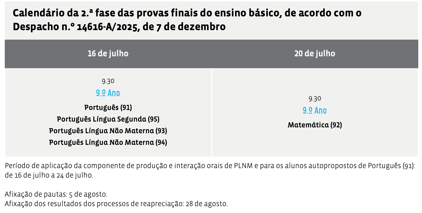 Calendário das provas de Final de Ciclo 2º Fase